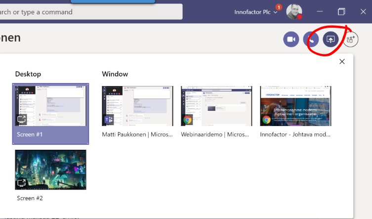 There is a new screen sharing button that can be found in chat. Then you choose what you want to share with others.