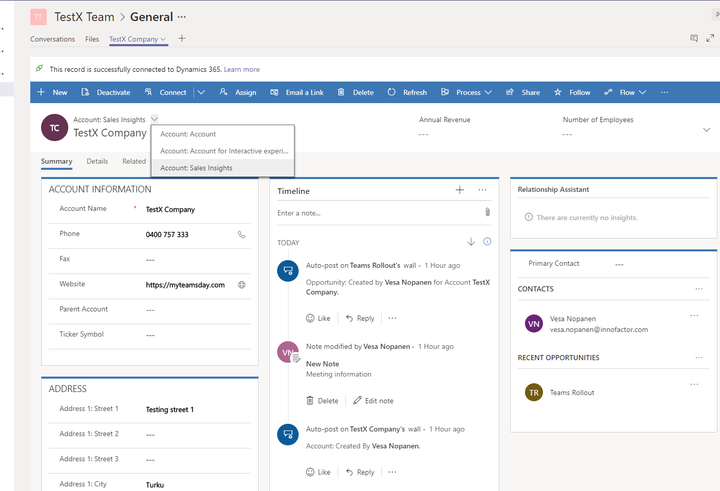 When you have added Dynamics app to your team, you can add it multiple times to channels – if you have to. For example in General channel you could have the Account-information and then you can have channels for different opportunities.