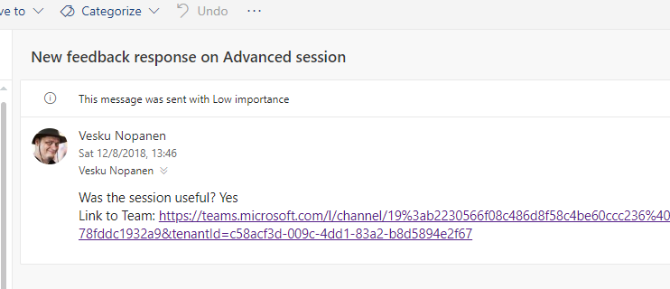 After responding to the Form I got Teams notification and emails as expected. This is really a simple way to create better notifications – and stay up to date whenever a Team Form gets responses. I prefer plain Teams notifications, but of course there are cases for emails – or many other possibilities.