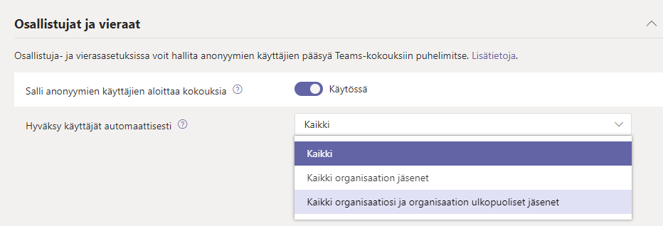 Mikäli asetuksena on “Kaikki organisaatiosi ja organisaation ulkopuoliset jäsenet” muuttuu tilanne niin, että kaikki käyttäjät pääsevät liittymään kokoukseen ilman hyväksyntää. Asetuksen on tarkoitus olla seuraavanlainen