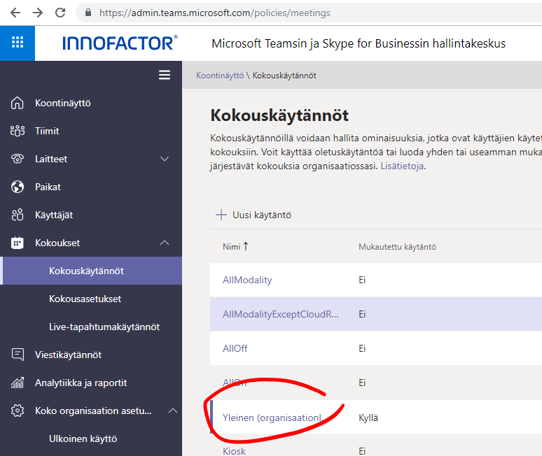 Entäpä sitten oletuksena päällä oleva “Kaikki organisaation jäsenet”? Oletus on tietysti riskittömin ja totuttu valinta, mikäli haluaa pitää kontrollin ja hyväksyä ulkopuoliset käyttäjät kokouksiin erikseen. Mutta on hyvä pysähtyä ja käydä lävitse jokaisen valinnan vaikutukset ja päättää niiden pohjalta organisaatiolle sopivin.