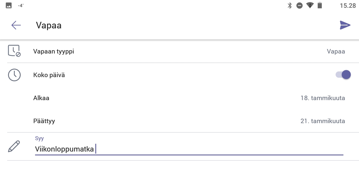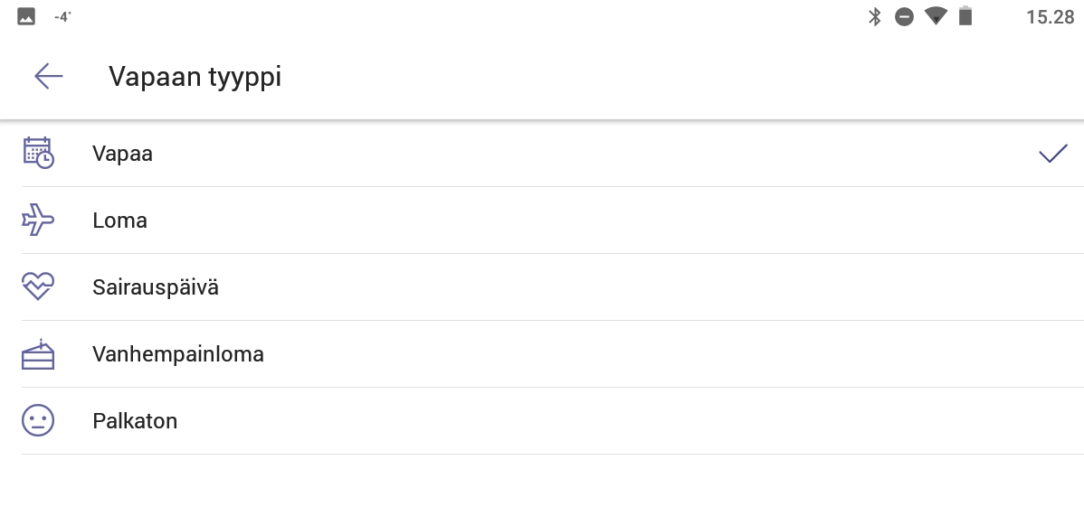 Vapaat voi pyytää suoraan käyttöliittymästä. Esimiehet voivat määrittää käytettävissä olevat vapaat ja muut asetukset voi tiimikohtaisesti. Esimerkkikuvissa Teamsin työpöytäkäyttöliittymän kuvakaappaukset ovat englanniksi ja mobiilikäyttöliittymän suomeksi. Oletuksena ovat vapaiden nimet on käännetty Teamsin toimesta. Vapaaseen liittyvän kuvakkeen voi vaihtaa sitä napsauttamalla.