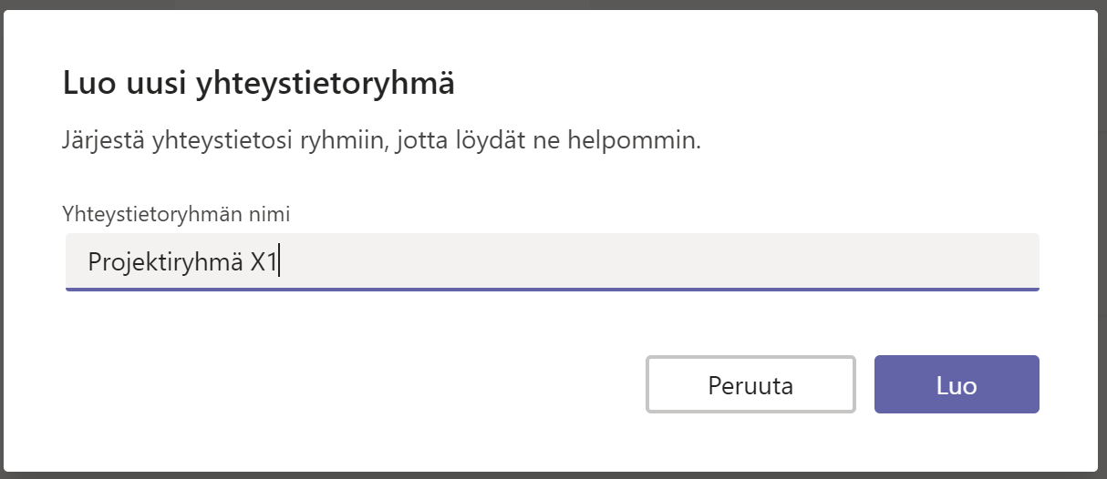Ensin kuitenkin muistutus kuinka uusi yhteystietoryhmä luodaan. Toiminto löytyy Teamsin vasemmasta alakulmasta kun Keskustelu ja Yhteyshenkilöt on valittuna.