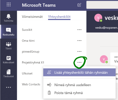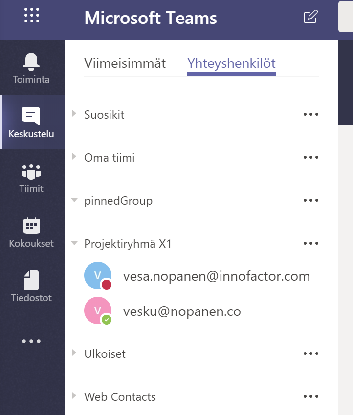 Tämän jälkeen “projektiryhmä” kaikki henkilöt löytyvät kontakteista ja heille voi lähettää helposti Teams-viestejä yli organisaatiorajojen.