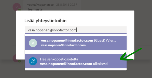 “Lisää yhteystieto tähän ryhmään” mahdollistaa sähköpostiosoitteen kirjoittamisen, jonka avulla kontaktit lisätään. Huom, jos käyttäjä on jo vieraana jossain tiimissä on syytä olla tarkkana että tulee valittua ulkoinen osoite jotta viestit menevät perille ulkoisen käyttäjän oman organisaation Teamsiin.