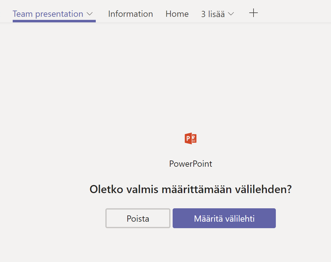 Esimerkiksi jos mallitiimissä on ollut tiimin esittely välilehdellä on uudessa tiimissä erikseen valittava välilehdelle erikseen mitä dokumenttia siinä näytetään.