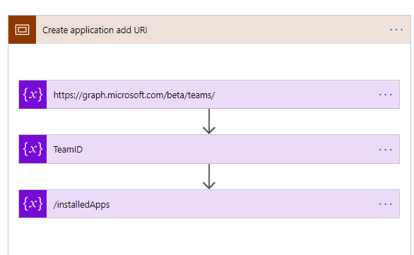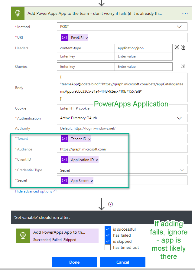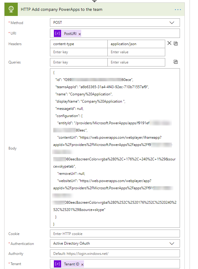 - Create HTTP Connector Post URI to add PowerApps application to the team