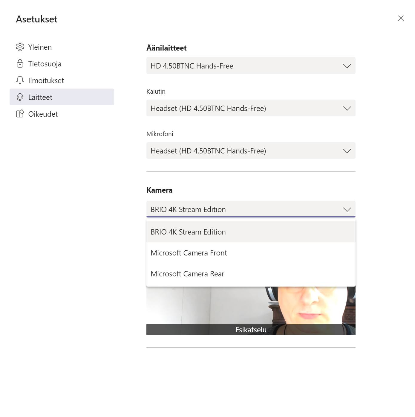 Asetuksiin on ilmestynyt myös Laitteet-osuus, jossa voi valita oletuksena käytettävät laitteet: kaiuttimen, mikrofonin ja kameran.