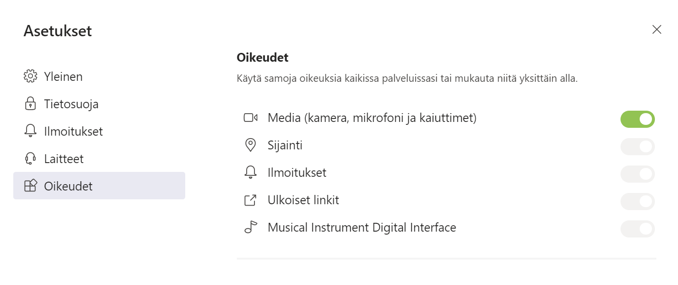 Asetuksissa on myös osuus Oikeudet. Tämän kautta annetaan Teamsin työpöytäsovellukselle oikeus käyttää mediaa, sijaintia, ilmoituksia, ulkoisia linkkejä sekä MIDIä(!). Tässä vaiheessa ainoa mitä voi muuttaa on Media, muut ovat aina päällä.