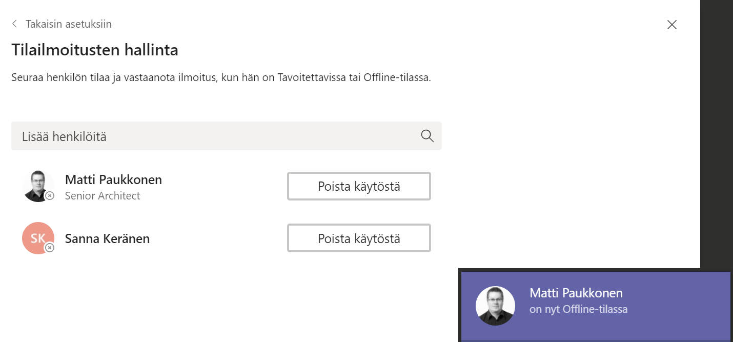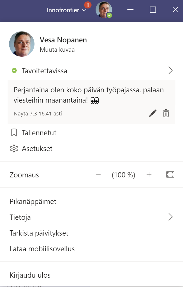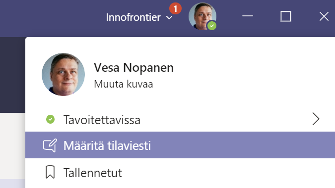 Teams sai jo jokin aikaa sitten myös mukautetun tilaviestin. Sitä on hyvä hyödyntää vaikkapa poissaolotiedon lisätäsmennykseen.