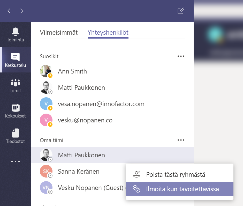 Tämä on tuttu ominaisuus Skype for Busineksesta: haluan ilmoituksen kun tietty henkilö on tavoitettavissa. Se toimii vain oman organisaatioiden muiden henkilöiden kanssa. Suuntaan Keskustelut-sovellukseen ja siellä Yhteyshenkilöt-välilehdelle.