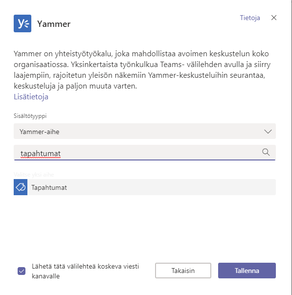 Tämä uudistus on ollut tuloillaan jo pitkään ja vihdoinkin eilen Yammer-välilehti ilmestyi valikoimaan. Yammerin sovelluksella voi kytkeä siellä olevat keskustelut aiempaa paljon fiksummin osaksi Teamsin tiimejä ja kanavia. Välilehdelle voi valita näytettäväksi joko yksittäisen ryhmän (koko yritys ei ollut valittavissa) tai aihesanat (topic/aihe = Yammerin hashtag). Yammerin välilehti on käytettävissä työpöytä- ja selainversioissa.