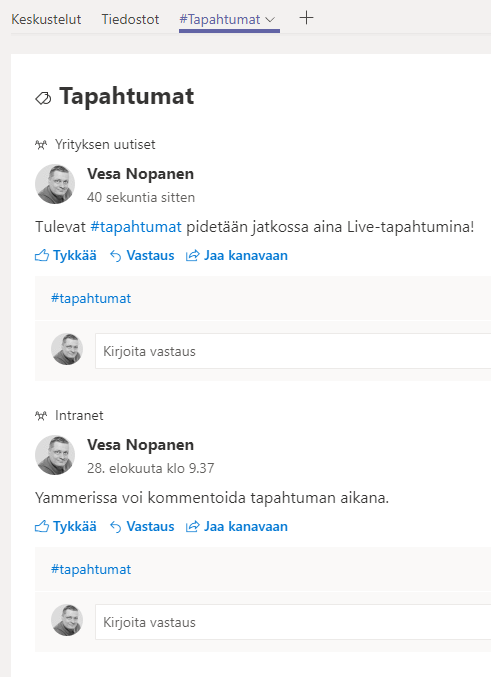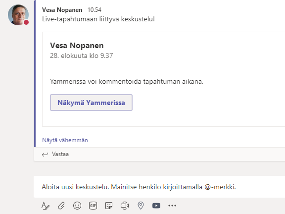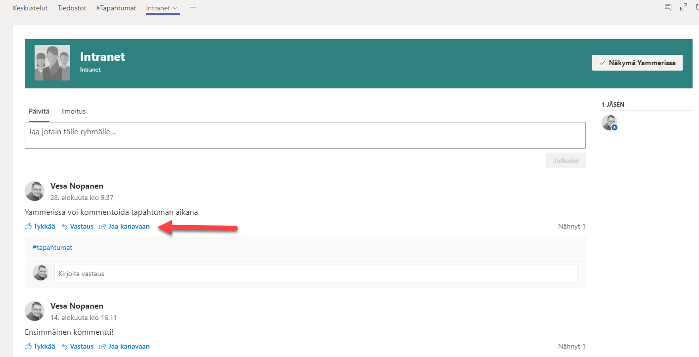 Jaa kanavaan mahdollistaa yksittäisen keskustelun nostamisen helposti kanavan keskusteluun.