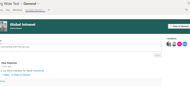 While I was a bit disappointed there isn’t yet a way to generate that EntityID and Content URL from Yammer IDs I am glad this addition can be done centrally. This way a company can add certain Yammer tab (or two, if a topic is important for some teams) behind the scenes. This makes Yammer familiar to teams since they face it in their work channels.