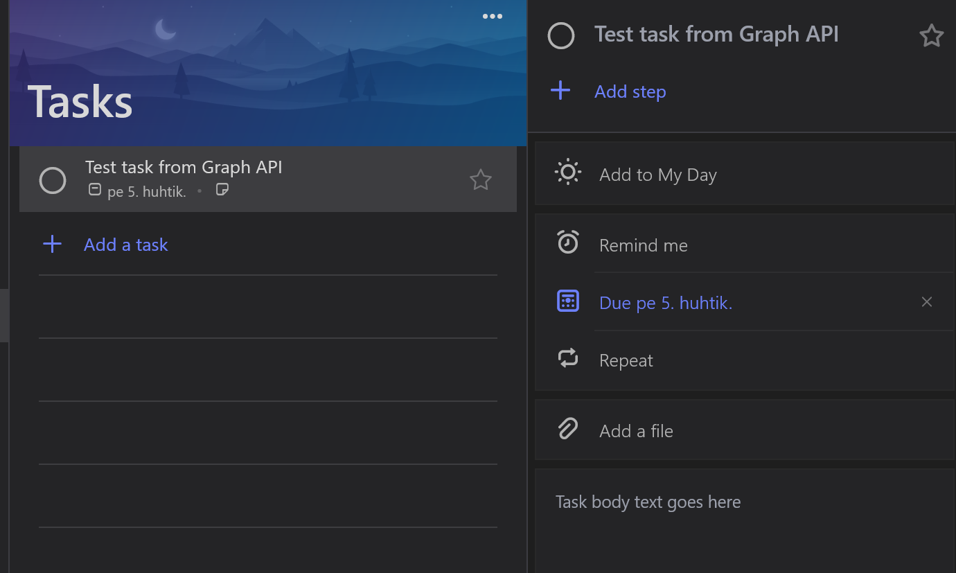 ToDo Graph API has appeared the in documentation Graph API at Docs.Microsoft.Com . This opens up new possibilities to aggregate user tasks into a single app – ToDo. I did some testing with the API to see what is possible – and what is not.