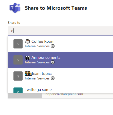 Valitse tiimi/kanava mihin linkki jaetaan. Haku on erittäin toimiva tässä. Ja emojit on tuettuina nimissä!