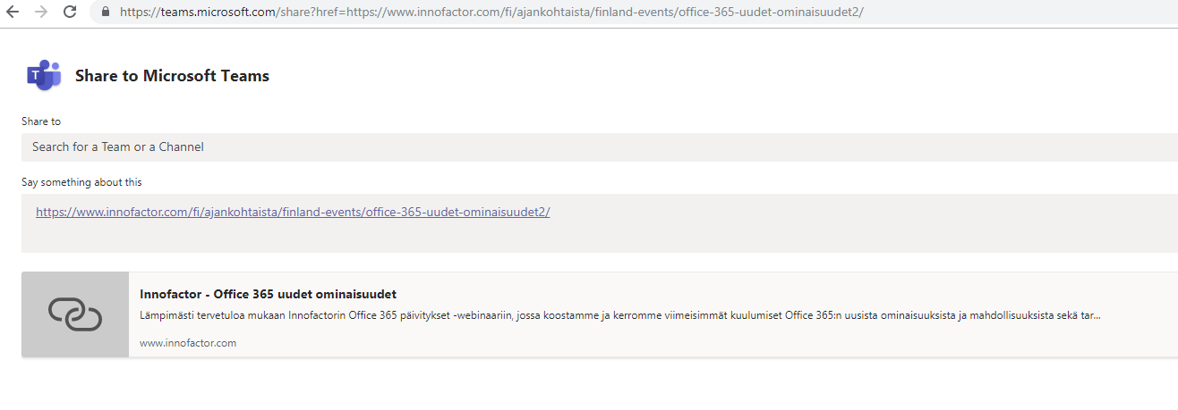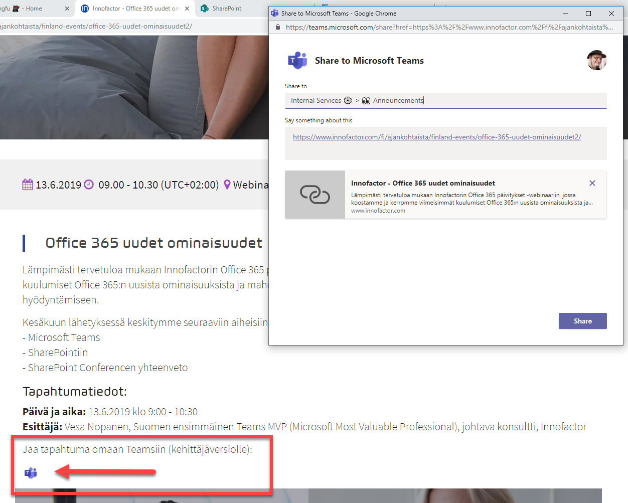 Lisäsimme varsinaisen jakokomponentin seuraavan webinaarini ilmoittautumissivulle, josta voit käydä tätä kokeilemassa. Mikäli sinulle näkyy sivulla Teams-ikoni, jakoikkuna avautuu ja pääset valitsemaan tiimin olet ensimmäisten joukossa tätä tekemässä! Mikäli näet vain tekstin “Share to Teams” Teams-ikonin sijaan, et valitettavasti pysty tätä toimintoa vielä käyttämään. Huomaathan että selain, jolla sivulla käyt, tulee olla kirjautuneena Teams-ympäristöösi jossa tätä haluat kokeillla.