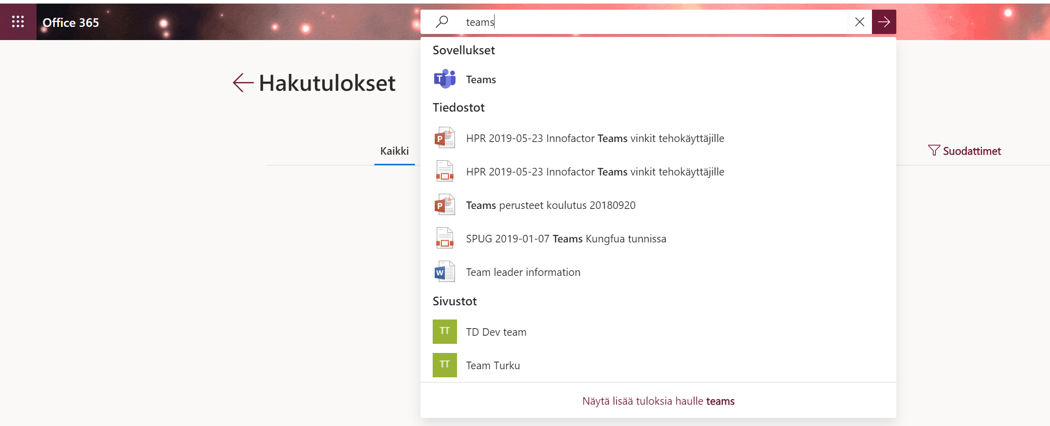 On kuitenkin hyvä muistaa, että paras paikka tiedostojen hakemiselle on Office 365:n haku. Vaikka Teams ja Microsoft Search for Bing hakevatkin myös tiedostojen sisällöstä tietoja, ei niiden haku sisällä niin monipuolisia suodattimia kuin Office 365.
