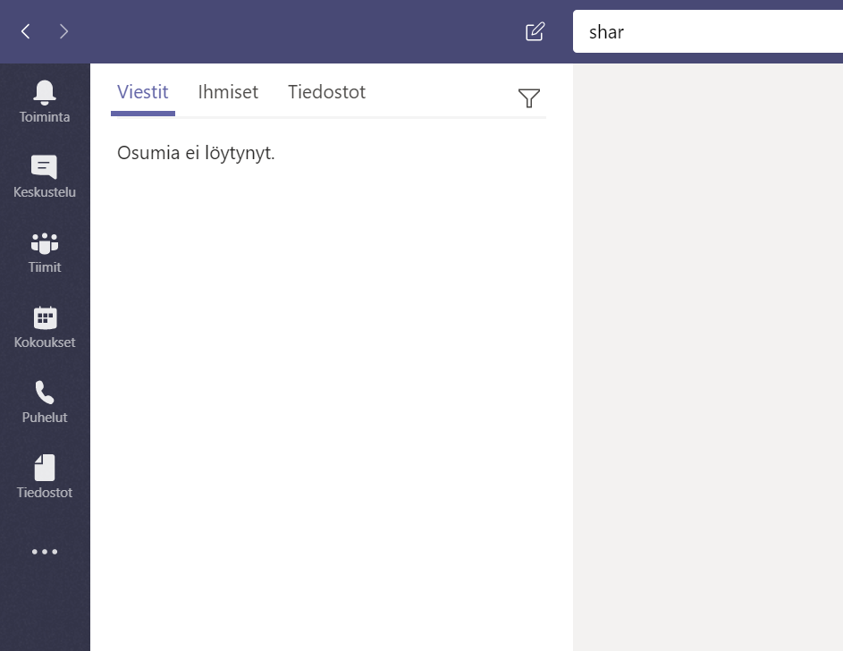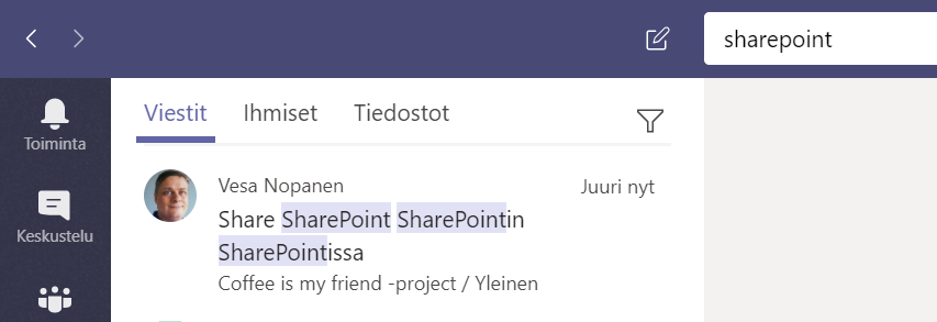Hakua on selkeästi optimoitu siihen suuntaan, että sisältöä tutkitaan jonkinlaista listausta vasten. Kun haet Teamsin tekstistä sisältöä käytä hakusanana ensimmäistä sanaksi tunnistettavaa tavua (esimerkiksi tiimi). viittä tai kymmentä kirjainta. Verrattuna aiempaan, jossa sanan piti olla kirjaimellisesti sama, on tämä hyppy eteenpäin.