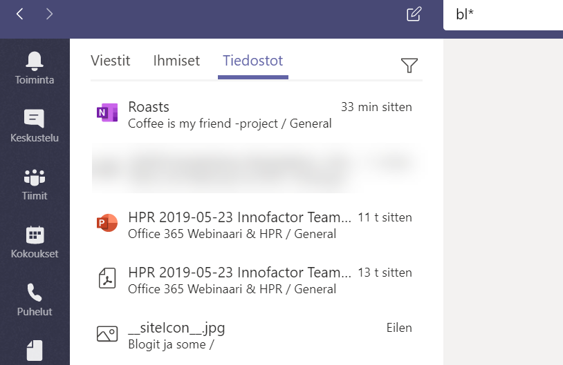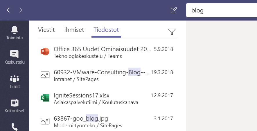 Jotta asia ei olisi niin yksinkertainen niin tiedostojen sisällön hakemiseen käytetään Office 365:n hakua. Teamsissa hakutulokset on rajattu niihin tiimeihin, joissa käyttäjä on mukana. Tiedostojen haussa voi taas käyttää villikortteja, eli haut blog ja blog* tuottavatkin eri tulokset.