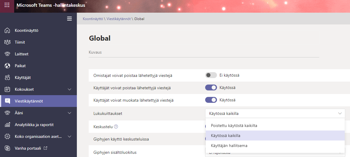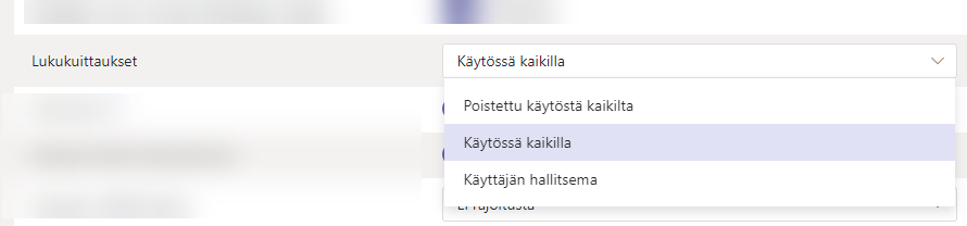 Tässä vaiheessa olisi hyvä tehdä hallintakäytäntöpäätös miten viestien lukukuittauksien kanssa toimitte organisaatiossa. Oletuksena päällä on “käyttäjän hallitsema”.
