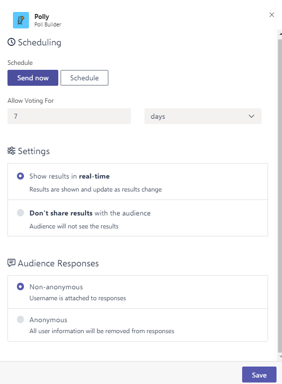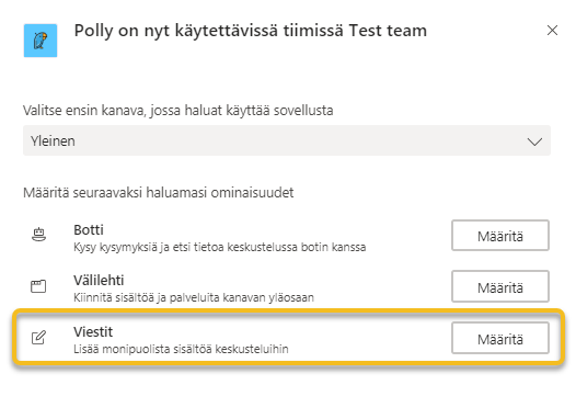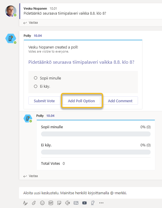 Polly on ollut mukana Teamsissa alusta saakka, mutta viimeaikojen uudistusten myös Polly on monipuolistunut runsaasti. Parhaiten uudistukset näkyvät keskusteluihin lisättävien kyselyiden paremman käyttöliittymän ja vaihtoehtojen kautta. Aloita lisäämällä tiimiisi Pollyn Viestit-toiminto, tämä onnistuu helposti Teamsin sovelluskaupan kautta.