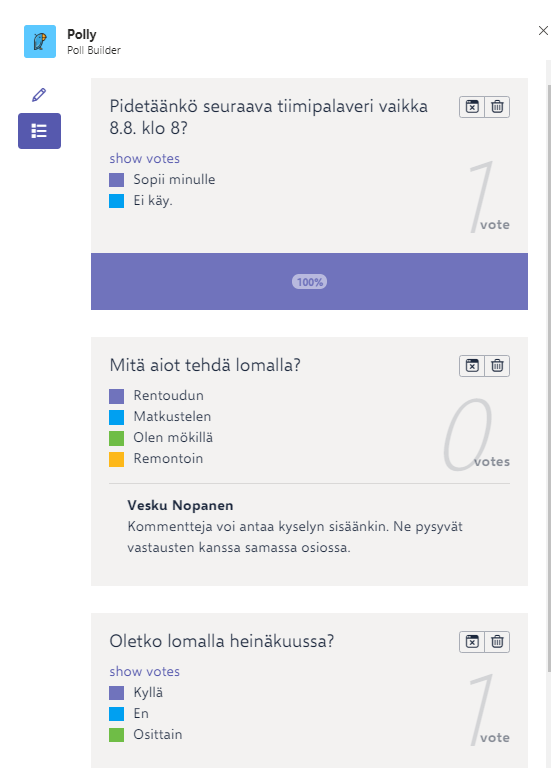 Pollyn käyttöliittymästä myös näkee miten kyseisen kanavan kyselyihin on vastattu. Samasta paikasta kyselyitä voi myös sulkea ja poistaa.