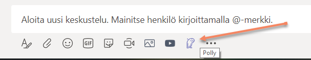 Tämän jälkeen voit aloittaa kyselyn teon. Huomaa että Polly ilmestyy tiimisi viestien luonnin työkaluriviin jos kyselyitä pääsee jatkossa tekemään..