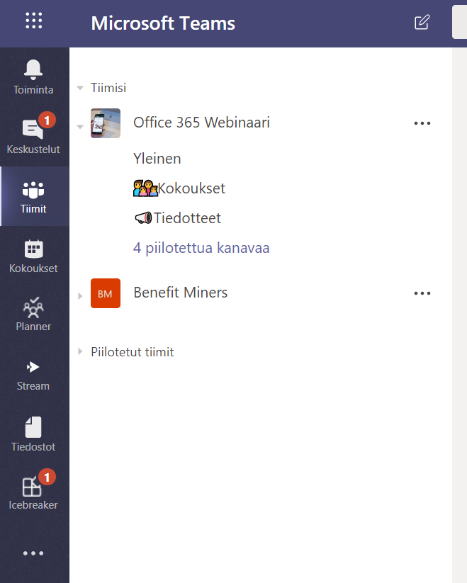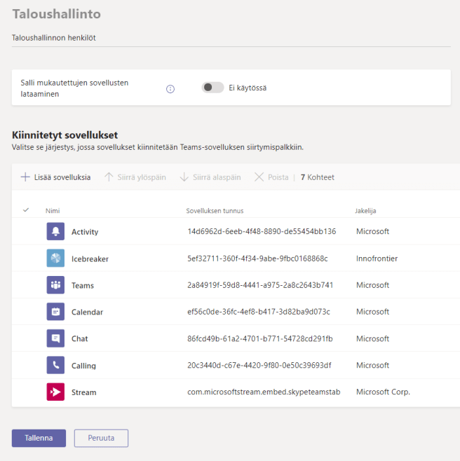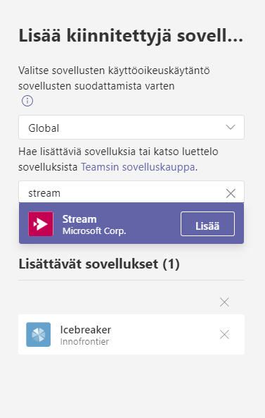 Teamsin vasemman laidan työkalut ja niiden järjestyksen voi tätä nykyä muokata organisaation tarpeiden mukaan. Mikäli käytössä on paljon esimerkiksi Planner ja Stream, voidaan ne tuoda vasempaan laitaan kaikkien saataville. “Tyrkylle” ne ovat myös silmien ulottuvilla paremmin kuin välilehdissä tai … -valikon takana.