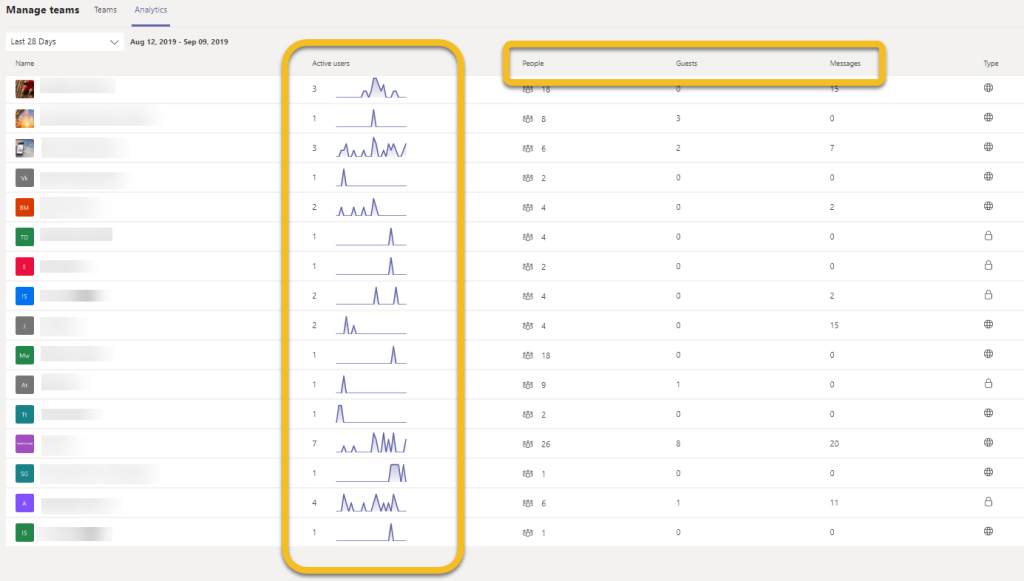 The the list you can see a real neat graph showing it’s team’s activity (active users) followed by number of people in a team, number of guests, count of messages and the type (public, private)