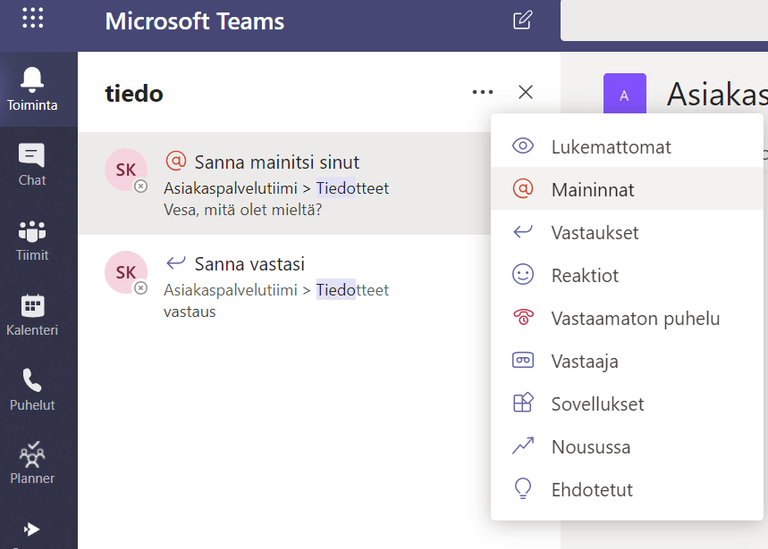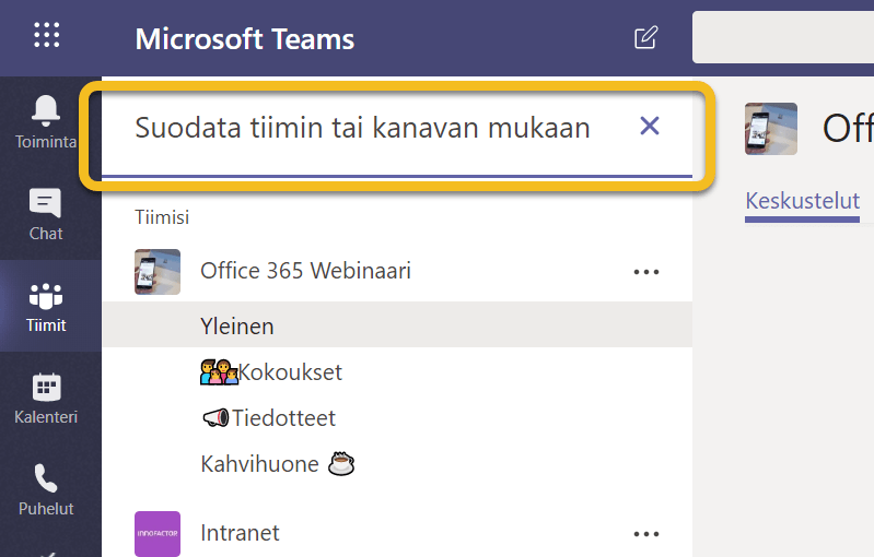 Tässä näkymässä voi suodattaa haluamansa tiimit tai kanavat näkymiin yksinkertaisesti kirjoittamalla osan tiimin / kanavan nimestä. Suodatus ulottuu myös piiloitettuihin tiimeihin, eli se kattaa kaikki ne tiimit joissa käyttäjä on mukana.