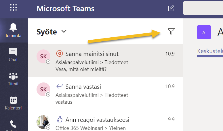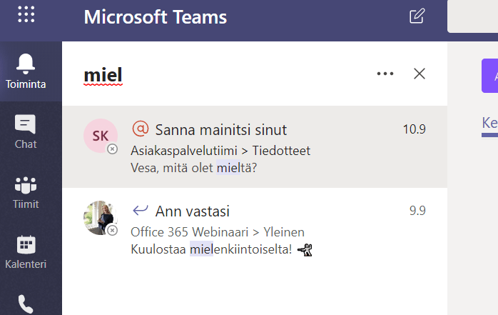 Viime viikolla Teams sai jälleen uuden käyttökelpoisen ominaisuuden: mahdollisuuden suodattaa tiimejä/kanavia, toimintasyötettä tai keskusteluja käyttäen vapaata tekstiä. Kyseessä on aina listan suodatus, ei haku sisällöstä.