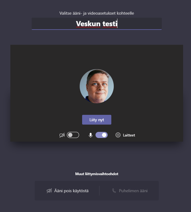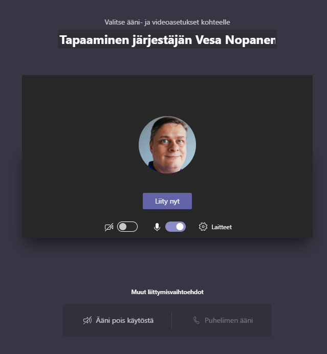 Kokouksen aloittaminen on helppoa – napsauttaa vain “Järjestä kokous nyt”-painiketta ja valitsee tuttuun tapaan omat laiteasetukset. Kokous saa automaattisesti nimekseen “Tapaaminen järjestäjän Vesa Nopanen kanssa” – otsikon voi kuitenkin muuttaa itse mieleisekseen.