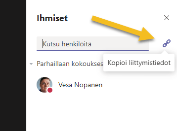 Tämän jälkeen kokous toimii kuten aikataulutettu Teams-kokous. Voit kopioida liittymistiedot Ihmiset-valikon takaa tai lisätä henkilöitä (myös ulkopuolisia) kirjoittamalla heidän sähköpostiosoitteensa (tai mikä heidän Teams-tunnuksensa onkin) jolloin heidät yritetään liittää kokoukseen heti.