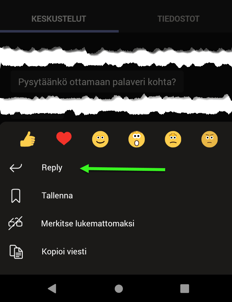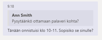 Teamsin mobiilisovellus on saanut uuden ominaisuuden: viestien lainaus keskustelussa. Tämä toimii vain yksityis/ryhmäkeskusteluissa. Lainaaminen tapahtuu painamalla sormella pitkään viestiä jota haluaa lainata ja valitsemalla “reply”. Suomennos ei ole vielä ehtinyt mukaan.