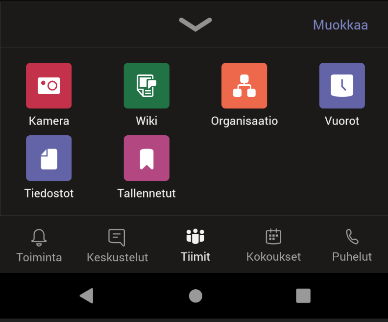 Tätä kautta pääsee hyvin tiedostoihin, tallennettuihin viesteihin, vuoroihin sekä voi avata Teams-kameran kuvanottoa varten. Kamerassa on etuna mm. se että näitä kuvia ei tallenneta itse laitteeseen vaan ne päätyvät suoraan Teamsiin, jolloin ne ovat organisaation hallussa ja suojaamina jatkuvasti.