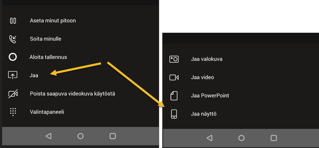 Muistutuksena vielä, että Teamsin mobiilisovelluksessa on mainio toiminto jolla voi jakaa puhelimen näytön kokoukseen osallistujille. Näytön jakaminen löytyy kokouksessa ollessa sieltä mistä jakaisi muutakin sisältöä puhelimesta.