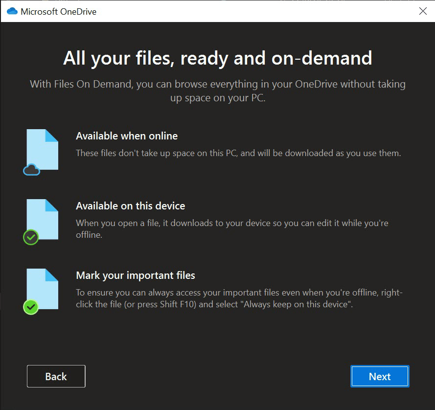 Remember to check Files on Demand settings. I recommend you mark some files to be always available to your (offline use!) and then save some space on others you don’t need that often.