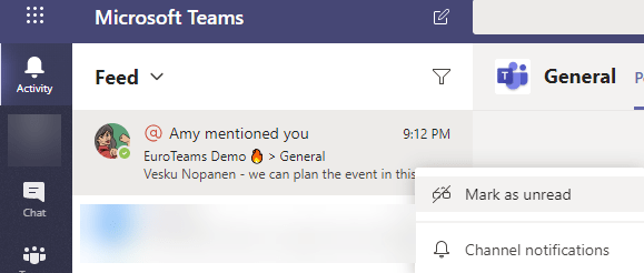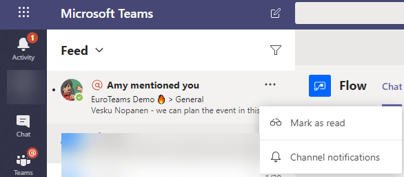If you right-click the notification text you can open the same menu as with clicking … -menu. Right-click is of course a lot quicker way since you don’t have hit those three dots with a waving mouse-hand. And did you notice – you can set the notification read/unread but also if the notification came from channel you can go directly to channel notifications menu from here!?