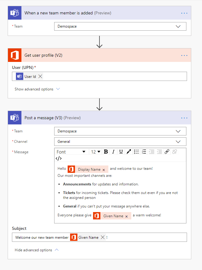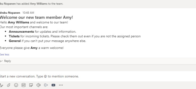 This is fairly easy to do, since it is done with Power Automate. No special licensing is needed for this one. The drawback is that it needs to be built for each team. However, for it is usually a team or project lead who does this. For smaller projects this may not be that fruitful but when you have a large project with tens of channels you might want to give newcomers a hand. And while doing that existing team members get a more visual cue that there is fresh blood in the team. Perhaps welcome message asks new member to introduce themselves and share some information about their skills?