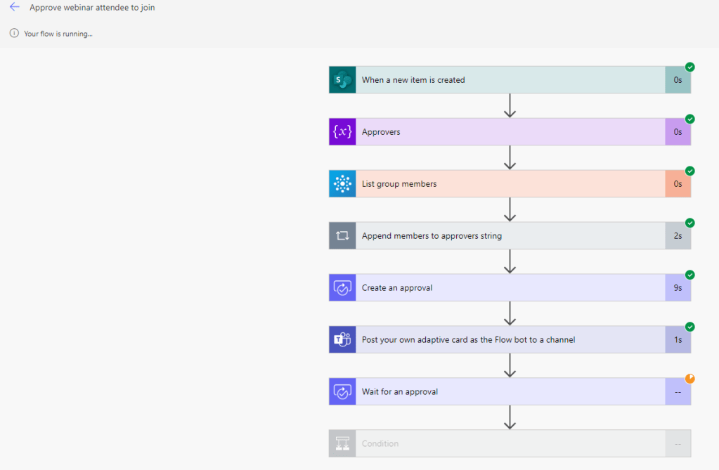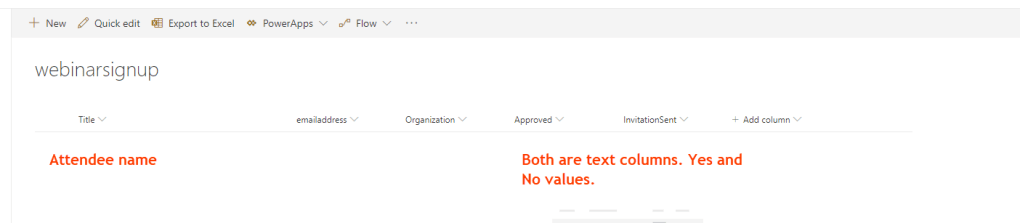 - When a new item is added to the sign-up list the Flow is triggered. Places for improvement: either a separate list for every webinar or a webinar information/identifies is included