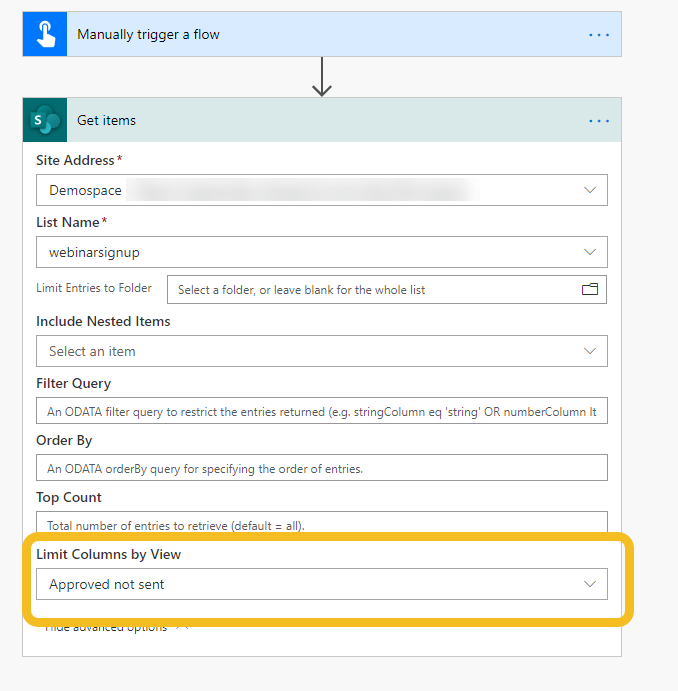 - Get items from webinar attendees that have been approved but not sent email yet. I used a SharePoint view to limit results.