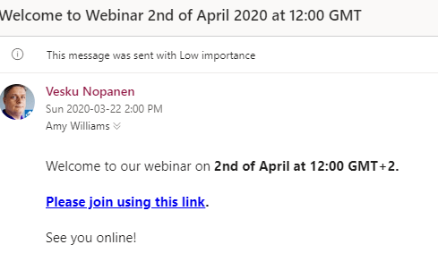 And recipients get the email and instructions how to join the webinar with the link. Instructions are missing in this demo/POC but it would be a really good practice to add them and also create that email more personal with including person’s name there.