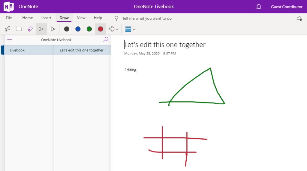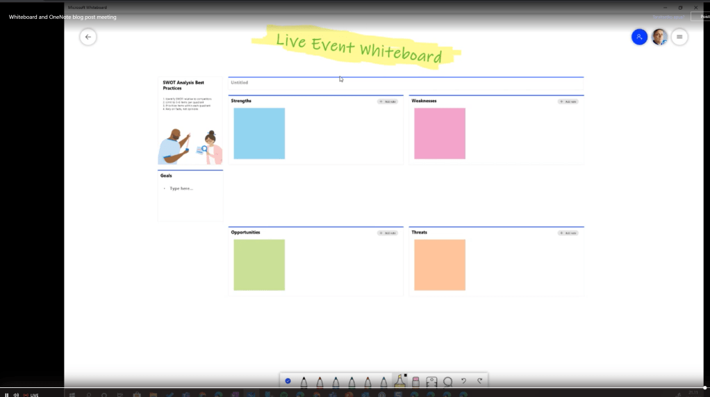 Even without sharing OneNote to everyone in the meeting – use Whiteboard or OneNote via shared screen to keep your audience captured and enable them to follow your live inking. OneNote also makes it easy to add multiple contributors so you can keep your screen shared for the audience and people from different locations can do their edits.