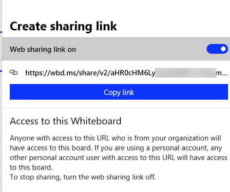 If you want to share Whiteboard with externals and you have a public event: all your presenters and Whiteboard-authors should login to Whiteboard using Microsoft Accounts and you just share the Whiteboard to them normally. You can’t currently mix Office 365 and Microsoft Accounts so it requires a bit more organizing to get everyone to log in using MA. If you want to do this you can create a sharing link from the same place you would add other authors in Office 365 version.