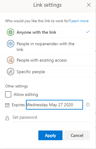 A new link is created for viewing. It is almost the same procedure: Allow editing is not checked. Since you know that people using this link can’t edit it you may have a different expiry date.