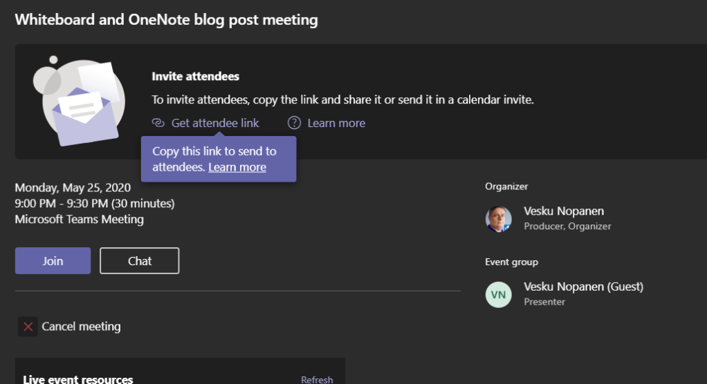 Now you can get two links: Attendee link (for viewing) and standard Teams meeting JOIN-link for presenters. Don’t share presenters link to anyone but intended presenters.