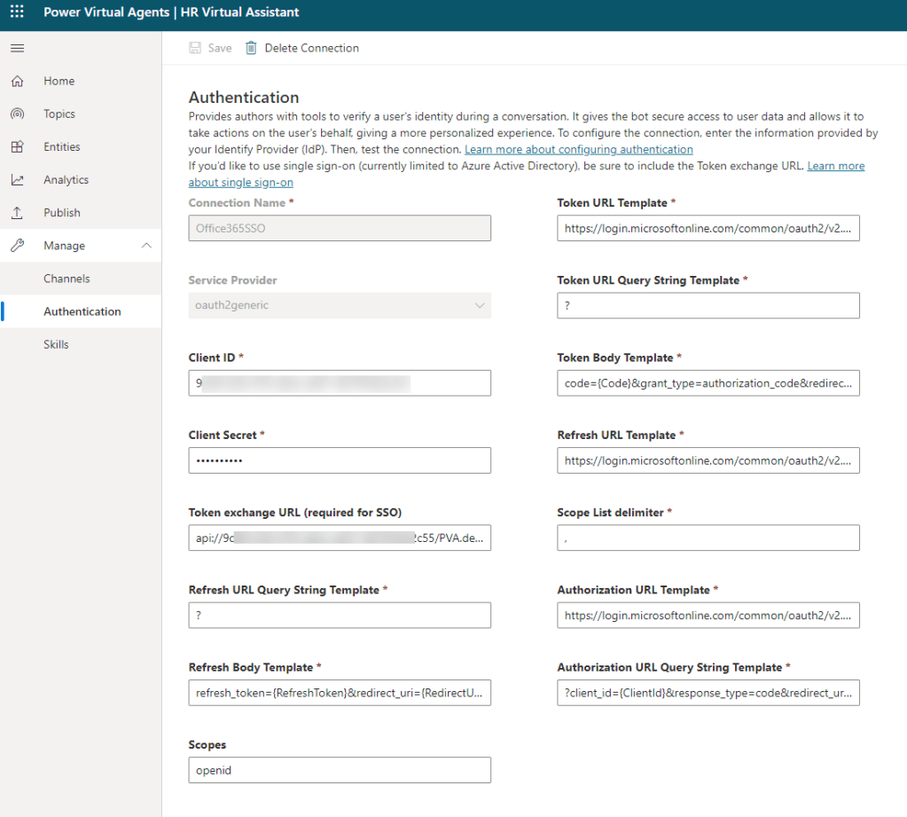 Copy the Scope URL after creation (it starts with api://) and paste it into Token Exchange URL in PVA Authentication settings.