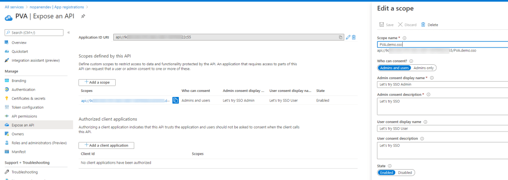 What I didn’t mention yet was the Token exchange URL (required for SSO). This can be done using following. Open Azure AD and navigate to your PVA service and open Expose an API. Use +Add a scope (if you don’t have application ID URL yet it will be created now) and type in your scope name and add some appropriate text to Admin/User logins. I have a demo environments so I didn’t really pay attention to those texts.
