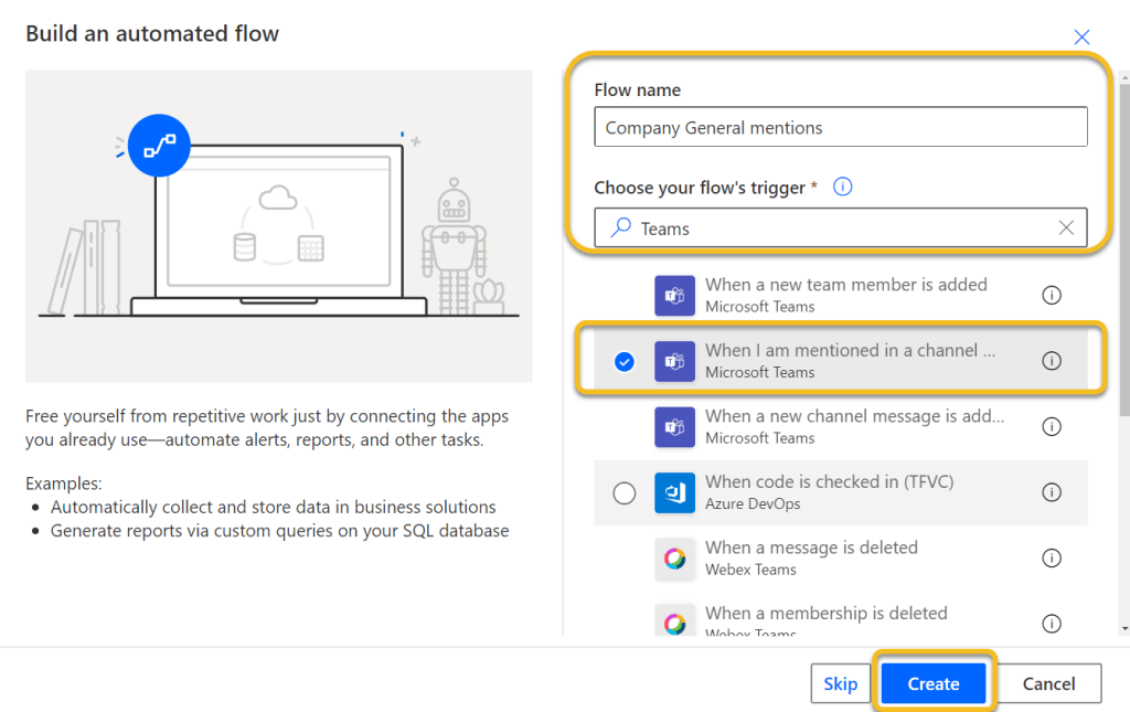 In the next dialog name your Flow and look for Teams-triggers. Choose “When I am mentioned in a channel”. Hit Create.